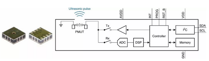 目前,有两种产品可向客户提供工程样品,即最大传感范围为100 cm的CH-101型和最大传感范围为500 cm的CH-201长距离型传感器。这些微型装置采用了紧凑的3.5 mm x 3.5 mm LGA封装,将压电式MEMS超声波传感器(PMUT)与定制的CMOS片上系统 (SoC) 结合在一起,完成了所有超声波ToF信号处理过程(图1)。CH-101和CH-201均采用1.8 V电源供电,并具有方便的I2C接口,可方便地集成到消费电子产品中。