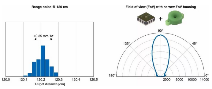 图2:CH-201型传感器的距离噪音仅为传统红外ToF传感器的百分之一(左图)。窄视场外壳是可用的参考设计之一,可将传感器超声波束整形以实现预期的视场(右图)。