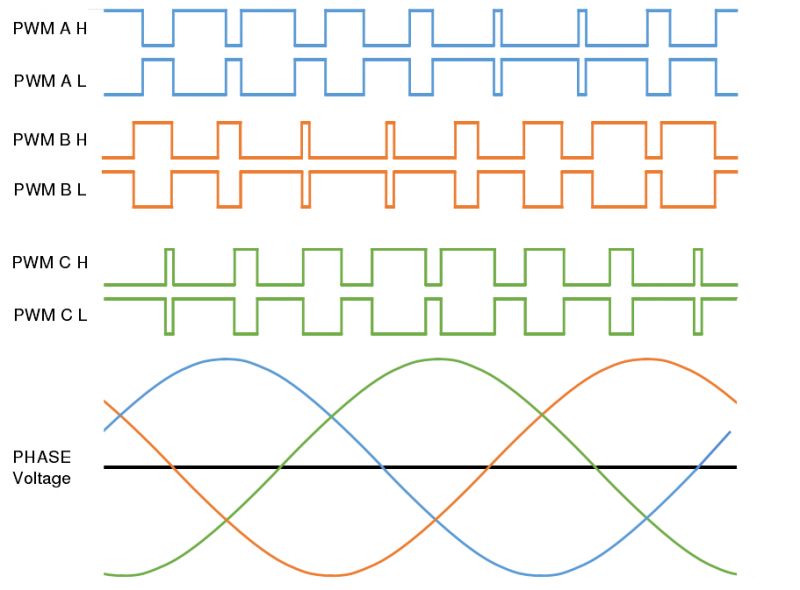 下图显示三个相位的典型PWM高侧和低侧图形,并显示了以正弦控制方式运行电机时消除PWM载波后的相应理想滤波相电压。