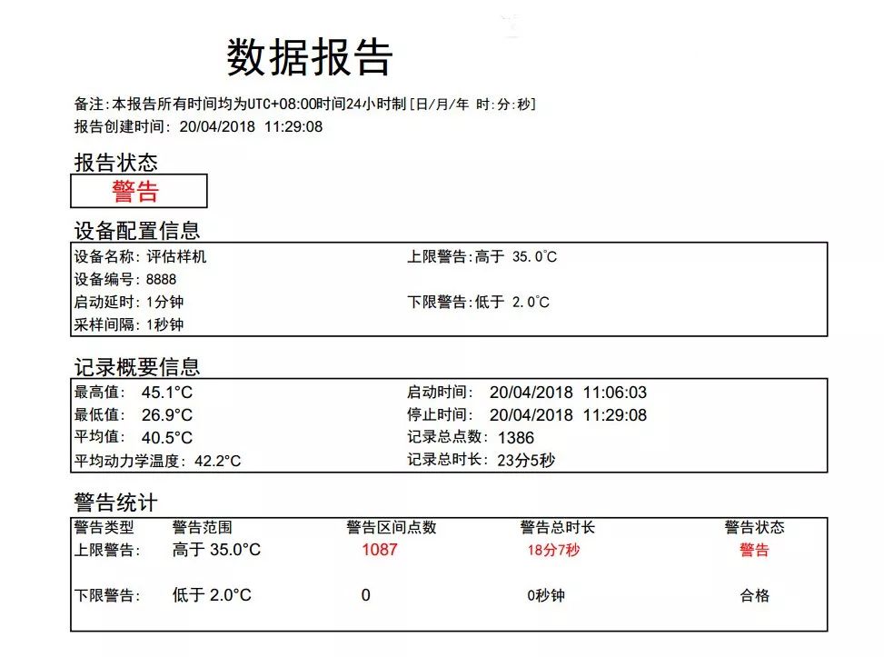 允许定义合法温度范围,PDF报告内自动标记不在温度范围内的温度记录点;