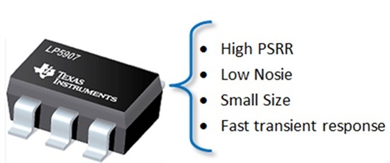 洁净电压稳压意味着低纹波和稳定的电压调节,这两点对于摄像头模块内的互补金属氧化物半导体 (CMOS) 图像传感器都很关键。CMOS图像传感器对于标称输入电压电平的变化十分敏感。电压纹波和电压下冲与过冲瞬变都会干扰到传感器内部的有源放大器和光检测器元件的功能性,从而影响到CMOS图像传感器捕捉入射光强度的能力,这意味着图像质量将会受到影响,在图像上出现斑点或黑线。借助于高电源纹波抑制 (PSRR)、低噪声和出色的瞬变响应特性,LDO能够最大限度地降低来自开关稳压器的纹波电压,或者是长PCB迹线内的耦合干扰。