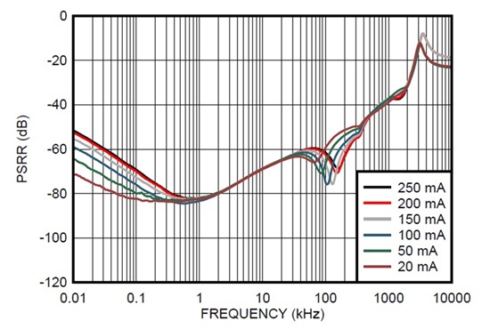 图像传感器需要多变的电压轨。一个电压轨通常在2.8V与3.3V之间,而其它电压轨通常需要介于1.2V与1.8V之间的更低电压。低压电压轨对于电源纹波更加敏感;因此高PSRR LDO更受青睐。如图3所示,LP5907-Q1提供高纹波抑制。