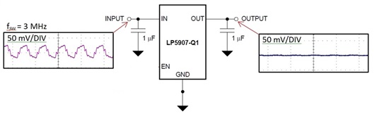 图4:输入电压纹波与LP5907经稳压输出间的比较