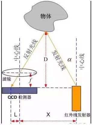 大多数红外传感器测距都是基于三角测量原理。红外发射器按照一定的角度发射红外光束,当遇到物体以后,光束会反射回来,如图所示。反射回来的红外光线被CCD检测器检测到以后,会获得一个偏移值L,利用三角关系,在知道了发射角度α,偏移距L,中心矩X,以及滤镜的焦距f以后,传感器到物体的距离D就可以通过几何关系计算出来了。红外传感器的优点是不受可见光影响,白天黑夜均可测量,角度灵敏度高、结构简单、价格较便宜,可以快速感知物体的存在,但测量时受环境影响很大,物体的颜色、方向、周围的光线都能导致测量误差,测量不够精确。