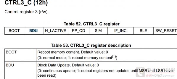 经过一系列的摸索,和ST工程师的帮助,终于解决了问题,见下图,那就是将BDU(Block Data Update)位置1,没有置1的话,数据没有准备好就被读出来也是有可能的,这也就是为何更新频率设置的越高就会越容易出现错误值的原因。