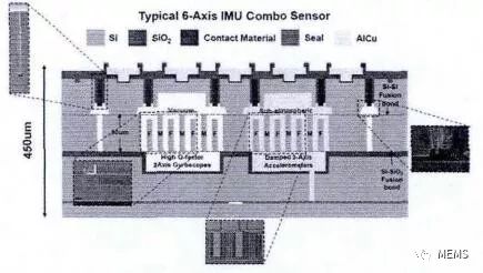 图11是美国mCube公司开发的三轴MEMS加速度计芯片横切面电子扫描显微镜照片,该款产品于2013年推向市场,是当时国际上最小的三轴MEMS加速度计,面积仅为2mm^2 。该款产品通过Al-Ge键合工艺使MEMS加速度计结构层圆片键合在MEMS专用集成电路IC圆片衬底上,MEMS加速度计结构层中存在硅通孔,硅通孔内填充的金属钨,借此钨TSV互连实现MEMS加速度计结构层与处于衬底位置的MEMS专用IC实现电气连接,封帽圆片通过键合工艺实现MEMS加速度计结构的局部气密性封装。从中可以发现,在此集成方案中TSV互连与惯性MEMS器件设计/加工紧密相关,惯性MEMS专用IC圆片与惯性MEMS结构圆片也是密切相关的,三者构成一个有机整体,惯性MEMS专用IC设计与惯性MEMS结构设计互相影响。