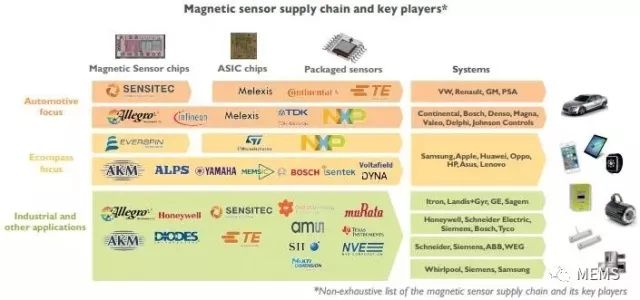 磁传感器供应链和关键厂商(来源:《磁传感器市场与技术-2017版》)