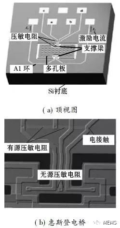 图3 MEMS磁传感器主要部分的顶视图和4个压敏电阻组成的惠斯登电桥
