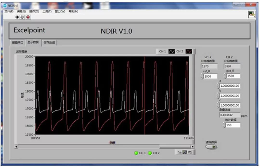 除了硬件方面,世健的设计工程师也开发出了配套的软件,开发者可以观测到方案中不同传感器通道的测试和分析数据。采样数据由串口传输到上位机,通过软件显示测量谱图,软件的左侧可以观察参考通道和CO2通道所测量的数据,其中白色曲线是参考信号,红色曲线是CO2检测信号。经过双通道的校准算法可以测量出气体浓度值等等,软件还可以保存采集数据。
