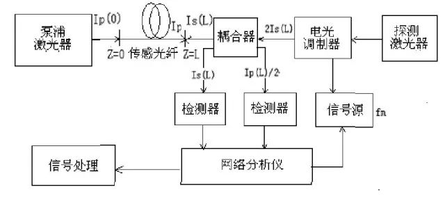 BOFDA同样是利用布里渊频移特性来实现温度/应变的传感,但其被测量空间定位不再是传统的广时域反射技术,而是通过得到光纤的复合基带传输函数来实现的。因此传感光纤两端所注入的光为频率不同的连续光,其中探测光与泵浦光频差约等于光纤中的布里渊频移分量
