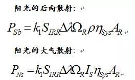 上式中,ε是目标的辐射系数;ρ是目标的反射系数;T是目标的温度(K);Δλ是光波长范围(μm);AR是接收机探测器敏感面面积(m²);k1是太阳光通过大气的透过系数;SIRR是太阳的辐射度(