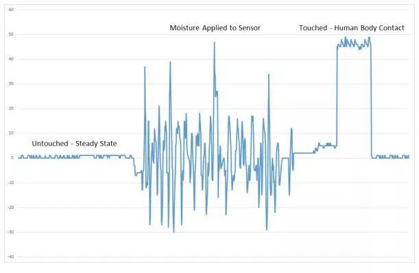 下图显示了电容式触摸传感器在未触摸(稳态)、有水分但未触摸和已触摸这三种状态下的典型响应。