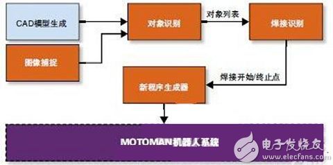图3所示为一个虚拟系统流程图,显示了系统如何从图像传感器收集数据。视觉数据和CAD模型数据被搭配使用,用来确定对象列表,对象列表随后被发送给焊接识别模块,然后采用人工智能技术明确焊接要求。