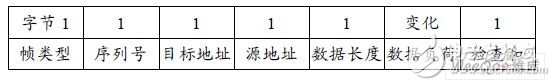 该帧的第1 个字符表示帧类型( frame. type) : 0x00为命令帧; 0x01 为数据帧; 0x02 为确认帧; 0x03 为错误帧; 0x04~ 0xFF 保留。第2 个字符表示包序列号( se2quernce number ) 。第3 个字符表示数据传送的目标节点( destination address) 。第4 个字符表示数据的源节点( source address) 。第5 个字符表示数据的长度( datalength) 。后续是数据负荷( data payload) , 长度为datalength。最后一个字符是校验和( check sum) , 其值根据下式算得。