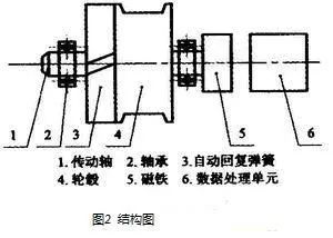 基于磁敏角度技术的拉线式位移传感器的功能是将拉线的机械位移换成可以计量、记录或传送的电信号,主要由自动回复弹簧、轮毂、磁铁以及数据处理单元等部分构成,结构如图2所示。