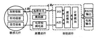 由敏感元件、测量电路、智能部件与接口部件构成,敏感元件的结构所示如图1,测量部件由选择单元、激励源和电荷检测单元组成;智能部件由I/O单元、A/D单元、滤波单元、角度计算单元等组成;接口部件由电流输出单元、RS232通讯单元等组成。