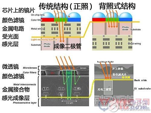 背照式CMOS传感器的具体结构如上图所示(源自索尼资料,其他芯片厂家的产品可能在细节上有不同,但大体意思是相同的),橙色的为光线路,黄色线为受光面。左边的传统式,明显看到光线通过微透镜后还需要经过电路层才能到达受光面,中途光线必然会遭到部分损失(包括被阻挡或被减弱)。背照式CMOS传感器的元件则不同,在改变了结构后,光线通过微透镜后就可以直接到达感光层的背面,完成光电反应,从进光量上改善了感光过程。