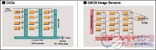 由图示可以看出,CCD传感器中每一行中每一个象素的电荷数据都会依次传送到下一个象素中,由最底端部分输出,再经由传感器边缘的放大器进行放大输出;而在CMOS传感器中,每个象素都会邻接一个放大器及A/D转换电路,用类似内存电路的方式将数据输出。简单说就是对待单个像素点上得到的电荷数据有不同方法,CCD是全部传输出来再统一处理,CMOS是先分别处理在传出来。这两种方式并不是人们凭空想象出来的,而是由CCD和CMOS的制作工艺决定的,因为CMOS器件内传输数据会有较高的失真,所以需要先做处理。