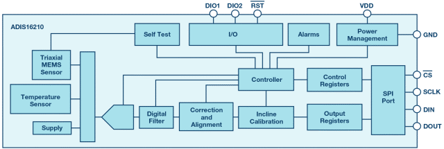iSensor器件专门针对某些应用而开发。例如,图2所示的ADIS16210专门针对倾斜应用而设计并定制,因此,它能提供<1°的相对精 度且开箱即用。这主要归功于集成信号处理和特定器件校准,以 便实现最佳精度性能。iSensor器件将在稳定性部分进一步讨论。