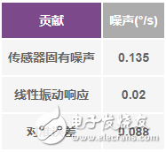 表1总结了ADIS16488A中来自各个因素的陀螺仪噪声。公式12给出了0.15°/s (rms)的整体噪声估算值(ωNOISE),表示表1中所有三个噪声源的平方和根值(RSS)。