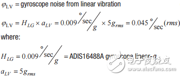 当振动幅度以加速度(grms)表示时,与线性加速度参数相乘可估算陀螺仪测量中产生的噪声。例如,当ADIS16488A承受5g(rms)的振动时,由于线性加速度等于0.009°/s/g,因此其陀螺仪中的 噪声估算值将为0.045°/s (rms)。