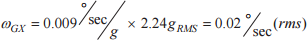 利用公式通过线性加速度参数乘以ASDF (f)曲线幅值2.24grms,可估算产生的噪声电平为0.02°/s (rms)。此噪声电平比通过公式5到的0.045°/s (rms)低55%,利用公式的方法未采用频谱项评估此噪声源。这种改善是采用频谱项定义振动曲线以获取值的一个示例。