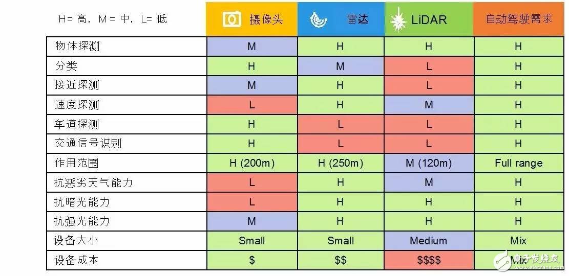 图1,用于自动驾驶的摄像头、雷达和LiDAR三种传感技术比较