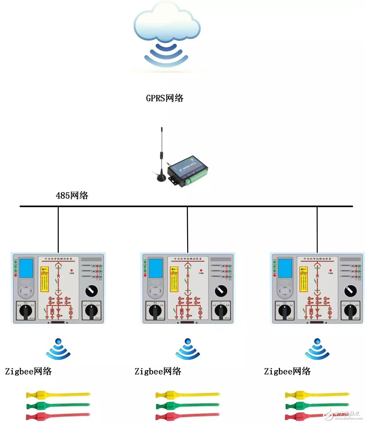 整个网络采用星型网络拓扑结构,开关柜中的智能控制开关作为主节点,温度采集表带作为子节点,子节点定时上传采集到的温度然后再次休眠。主节点之间通过RS-485网络相连,然后再通过GPRS DTU传送到监控后台。