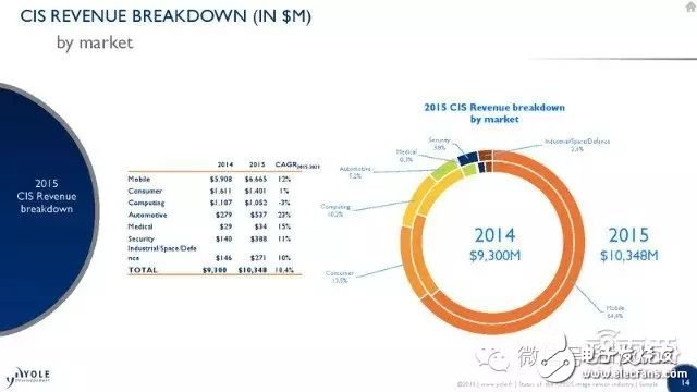 总体来看,2014年CMOS图像传感器市场总营收为93亿美元,这一数字到2015年则达到了103亿,复合增长率为10.4%。