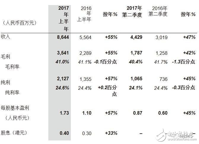 瑞声科技于2017 年上半年录得强劲的业绩表现,声学及非声学分部均呈现持续增长势头。本公司分别录得收入人民币8,644.3百万元及纯利人民币2,126.8百万元,较去年同期分别上升55%及57%。毛利率稳定维持于41.0%之较高水平。主要受惠于立体声和防水功能的升级趋势,动圈器件的销售额录得增长,按年上升22%,占总销售额之48%。得益于无线射频结构件及触控马达解决方案,非声学业务销售额较去年同期增长130%,为2017 年上半年总销售额带来48.5%之贡献,超过声学业务收入。本公司持续及有效的成本控制推动营运开支由2016 年上半年的14.7%下降至12.8%。2017 年半年的研发支出占收入的8.4%,略低于2016年的8.8%。半年纯利率上升0.2个百分点至24.6%。