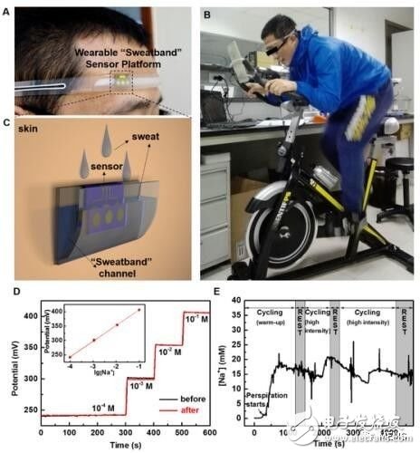 图2 (A)、(B)和(C)为可穿戴“导汗带”汗液传感器设备的照片和示意图;(D)汗液传感器芯片在穿戴前和穿戴后对不同浓度标准Na+溶液的校准曲线;(E)为汗液传感器在人体上运动过程中实时连续监测汗液中Na+浓度变化的曲线图