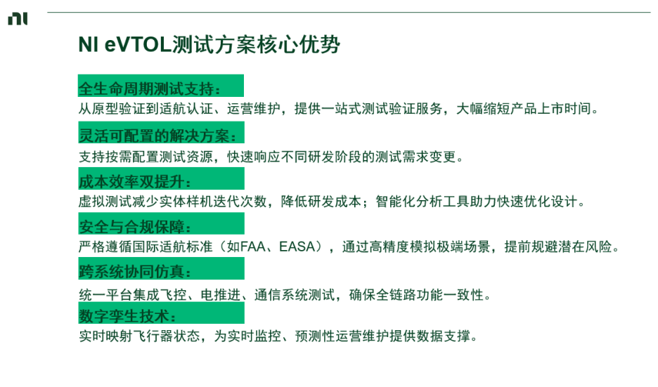 NI模块化的软硬件平台都能通过高度集成的测试生态,显著缩短开发周期达40%以上。我们不仅帮助客户通过DO-178C/DO-254等航空认证标准,更通过数字孪生等前沿技术,助力企业在低空经济浪潮中持续保持技术领先优势。