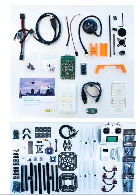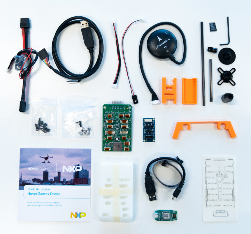 HoverGames无人机套件包括构建自己的四轴飞行器所需的大多数组件。该套件提供框架、电机、电子速度控制器、RDDRONE-FMUK66飞行控制器和一些额外的外围设备。应检查包裹中的内容,以确保没有丢失任何东西。