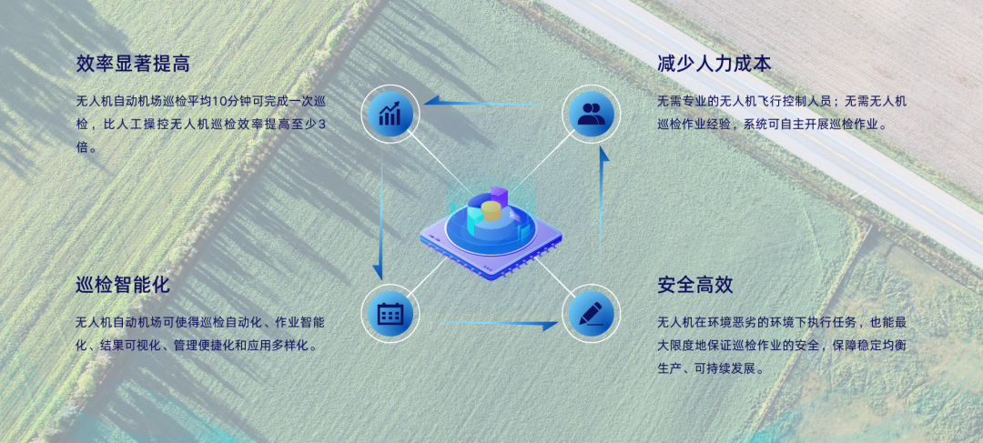 在智慧乡村领域的解决方案,以其无人机+无人机机场+无人机智能巡检系统,可实现无人值守,离线任务规划,远程精细化高频常态自动巡检作业。