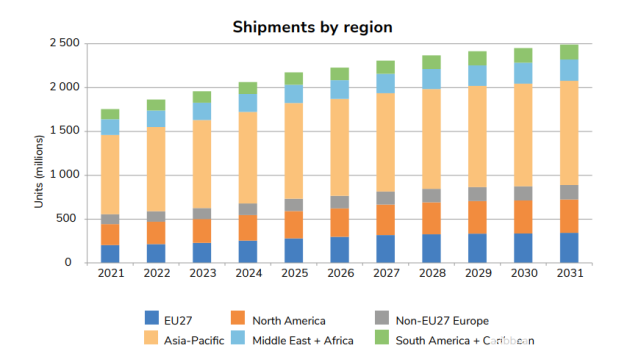 根据《报告》,预计从2021年到2031的十年间,全球GNSS接收机的年出货量将持续增长,从2021年的18亿台套增长至2031年的25亿台套,其中亚太地区仍将是最大市场。