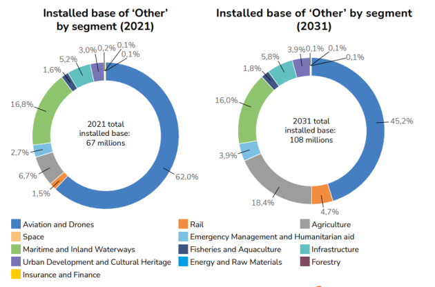 继消费解决方案、旅游和健康市场、道路与汽车市场之后,在其他GNSS细分市场领域中,航空和无人机市场将占据重要位置,预计其GNSS设备安装数量将从2021年的4200万台套增长至2031年的4900万台套。2021年,海事市场是第二大市场,但未来十年其市场份额有1%的轻微下降,预计其全球市场份额将从2021年的17%(相当于1100万台套)降至2031年的16%(2031年为1700万套),而农业则将在未来成为第二大重要的GNSS细分市场领域,其在2031年的份额预计将会达到18%(从2021年不到500万台套增长至2031年约2000万台套)。
