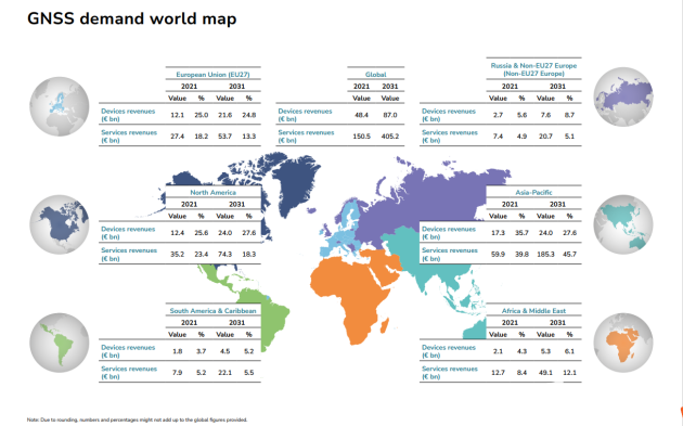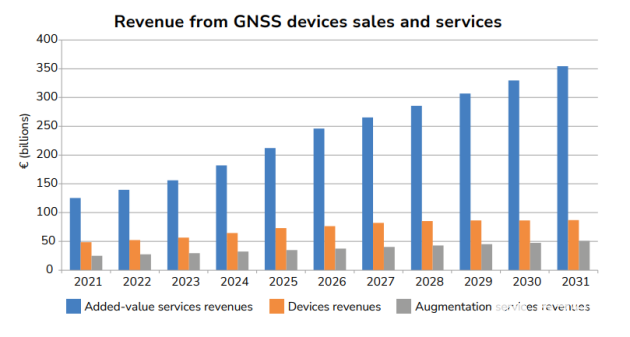 到2031年,全球GNSS服务收入(包括增值服务和增强服务)将达到4050亿欧元,占比超过全球GNSS下游市场总收入的82%。