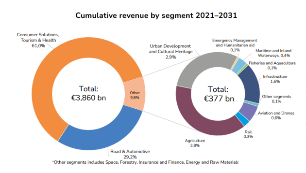 在其他细分市场的收入中,70%以上将来自农业(37%)、城市发展(26%)和基础设施建设(20%)。农业市场的收入大部分依赖于商业增强服务和自动操作设备,而城市发展和基础设施建设的主要收入来源与测绘应用(测绘、施工、选址或监控)有关。