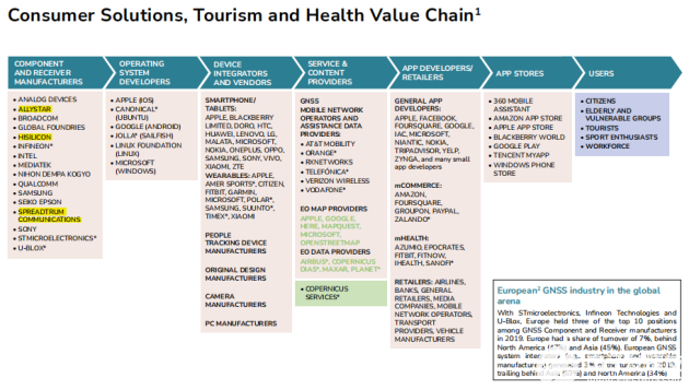 在市场规模、设备总量、装机总量、收入占比等不同维度均占主导地位的大众消费类解决方案成为了本次《报告》中的焦点。代表着全球GNSS应用发展的主流方向,也代表着中国北斗系统规模化应用的发展方向。《报告》针对大众消费类解决方案、出行旅游与健康这一细分领域按照产业链对不同环节上的关键企业做了梳理。我们惊喜的发现,三家中国大陆企业出现在了产业链最上游的器件和接收机领域榜单中。他们分别是ALLYSTAR(华大北斗)、HISILICON(华为海思)、SPREADTRUM COMMUNICATIONS(展讯通信)。
