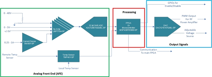 混合信号MCU(例如MSP430FR5969-SP)是一个很好的替代方案,可帮助减少用于遥测电路的FPGA资源和引脚,同时为遥测电路提供相同的功能,例如数据处理、电源时序控制和脉宽调制输出。MSP430FR5969-SP还具有集成的铁电随机存取存储器(FRAM),与双数据速率等传统存储器类型相比,这种存储器往往能更有效地抵抗辐射的影响。