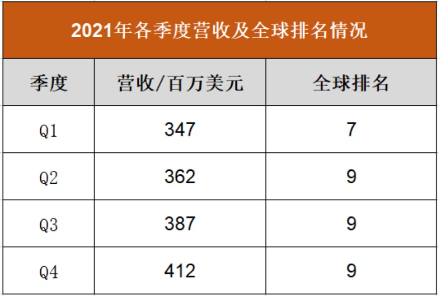 高塔半导体在2021年各季度的营收及全球排名情况
