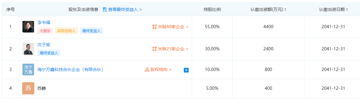 股权结构上,李书福为最大股东,认缴出资4400万元,持股比例55%。而星纪时代法人代表沈子瑜认缴出资2400万元,持股比例30%为第二股东,同时沈子瑜目前还担任亿咖通科技的CEO。