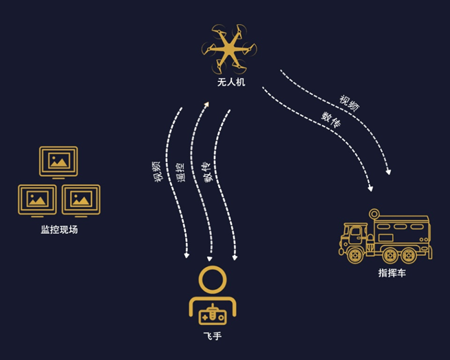 在犯罪、火警等突发现场,无人机的空中视角能提供更全面的及时的现场信息。远传融创Spintlink图传不但能提供无人机和前方飞手之间的视频、数传、遥控交互,而且现场后方指挥车可以通过第二套地面端设备同时接收无人机的下行视频和数传回传,及时掌握现场情况。