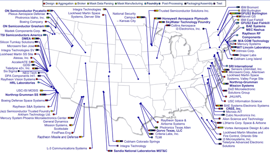 从目前美国国防部的“可信任代工厂计划”来看,国防与航空相关的应用尚未用到最先进的制程节点,只有eFPGA之类可以确保设计安全的部件才选择在海外制造。但对于未来的