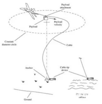 固定翼航空器拖着一根线缆在目标地区上空盘旋,这一结构的动力学特性会使线缆另一端自然向盘旋圆心接近。当线缆末端触碰地面时,末端上的锚钉确保其固定在陆地上;或者线缆末端接触水面后,利用末端高阻尼材料使其在水中基本静止。当线缆的拉力重量比足够高、线缆末端重量足够大时,整个系统将保持动态稳定,使得机载的物品可沿线缆滑降至地面或水面。