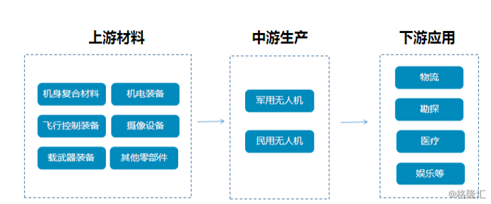 无人机产业链分上中下游。上游主要包括各种制造无人机材料供应商,有关材料包括机身复合材料、电机装备、飞行控制装备、摄像设备等;中游则为无人机生产商,上文提到军用无人机领域民参军企业主要负责生产中小型无人机;下游则为应用端。军用无人机主要用于勘探。