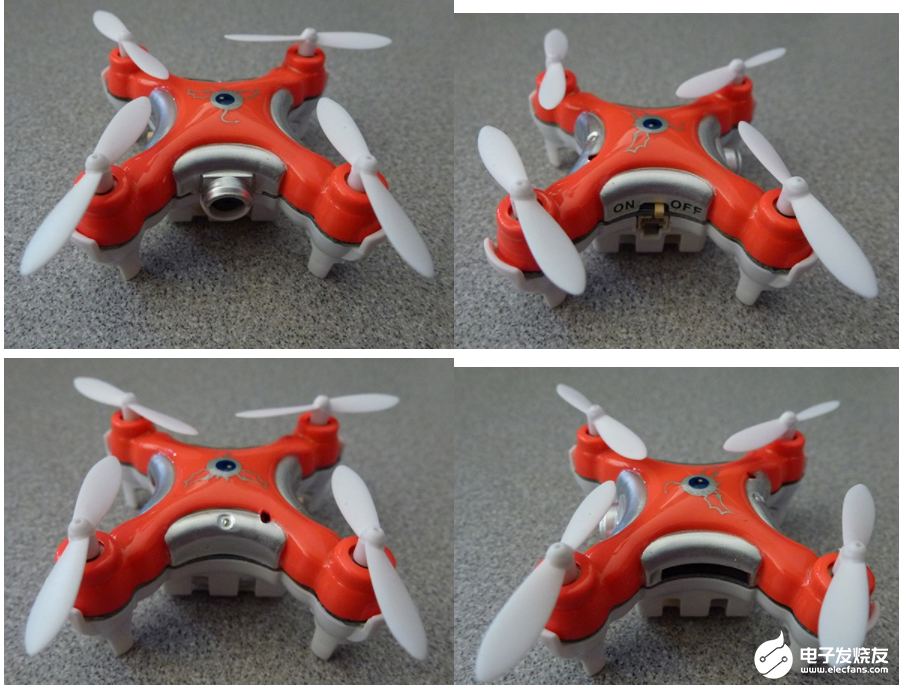 下面是从4个角度拍摄的四旋翼飞机照片,依次展示了摄像头、开/关装置和充电口、“摄录进行中”LED灯(在银色部分的右上角)和microSD卡槽: