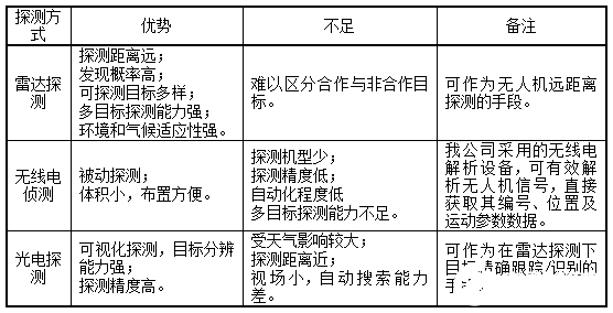 在无人机防控系统中,探测发现是最大的难点。解决无人机探测问题的途径主要有雷达探测、无线电侦测、光电探测和声音探测(其中声音探测在城市环境或复杂环境下很难有效区分无人机目标,且探测距离仅100m左右,尚不具备工程条件)。以无人机为典型代表的低慢小飞行器种类繁多、飞行机动灵活,世界各国大力发展多种传感器探测技术,基于各探测手段的优缺点。经对比分析,本系统采用雷达和无线电解析设备作为无人机的发现手段。