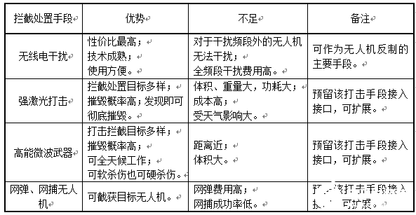 现阶段无人机拦截处置有多种手段,其中以电磁干扰、强激光打击、高能微波武器、网弹和网捕无人机最为典型,目标拦截处置手段优缺点对比见下表,我公司综合各拦截手段的优缺点,采用无线电干扰的方式,并预留其他打击拦截设备接口,可高性价比完成无人机拦截处置任务。