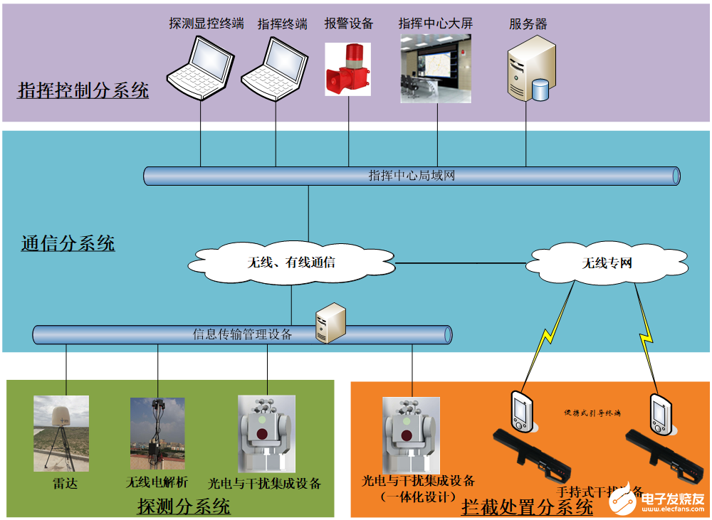 “守护者”无人机防控系统采用固定或车载架设的分布式组网构架,主要由指挥分系统、探测分系统、通信分系统、处置分系统组成,主要包括雷达、无线电解析设备、光电与干扰集成设备以及指挥终端、服务器等,分配便携干扰设备,通过智能化指挥控制,对探测分系统发现的目标快速拦截处置。系统构架如下图所示。